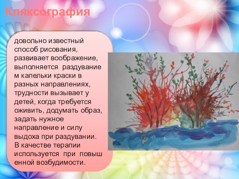 довольно известный способ рисования, развивает воображение, выполняется раздуванием капельки краски в