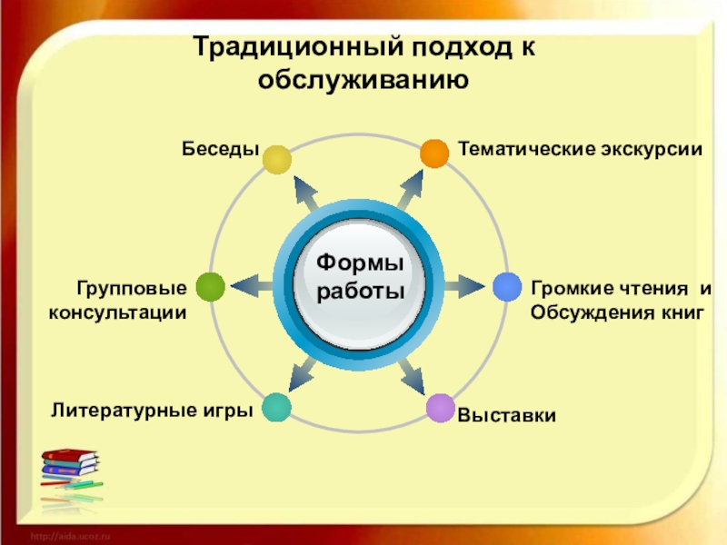 Тематические экскурсииБеседыГромкие чтения и Обсуждения книгВыставкиГрупповые консультации Литературные игрыТрадиционный подход к обслуживанию