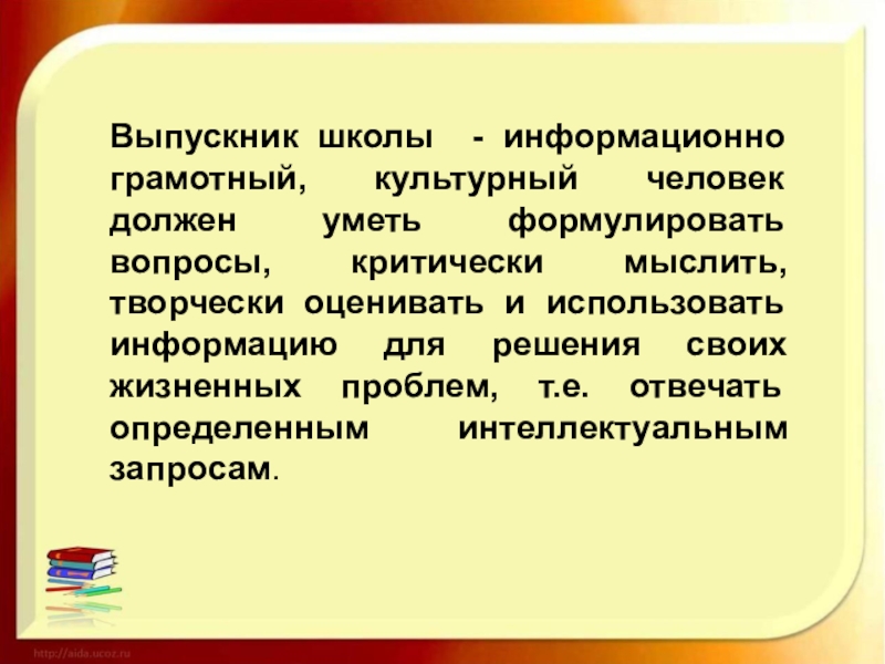 школы - информационно грамотный, культурный человек должен уметь формулировать вопросы, критически мыслить, творчески оценивать и использовать информацию для решения своих жизненных проблем, т.е. отвечать определенным интеллектуальным запросам.