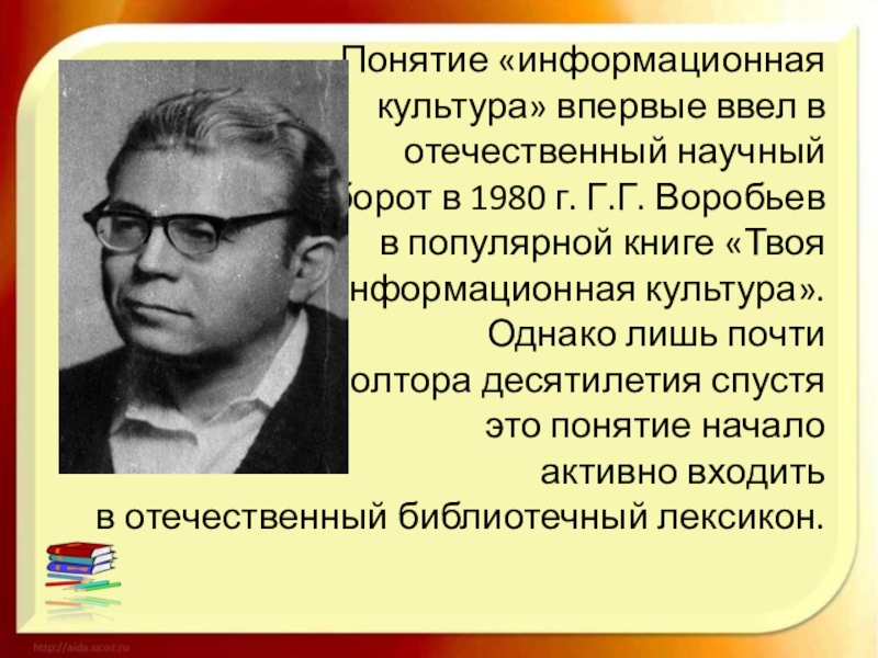 «информационная культура» впервые ввел в отечественный научный оборот в 1980 г. Г.Г. Воробьев в популярной книге «Твоя информационная культура». Однако лишь почти полтора десятилетия спустя это понятие начало активно входить в отечественный библиотечный лексикон.