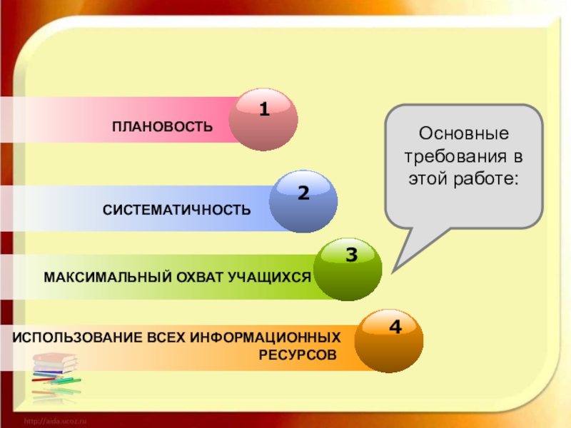 ПЛАНОВОСТЬСИСТЕМАТИЧНОСТЬМАКСИМАЛЬНЫЙ ОХВАТ УЧАЩИХСЯ4ИСПОЛЬЗОВАНИЕ ВСЕХ ИНФОРМАЦИОННЫХ РЕСУРСОВОсновные требования в этой работе: