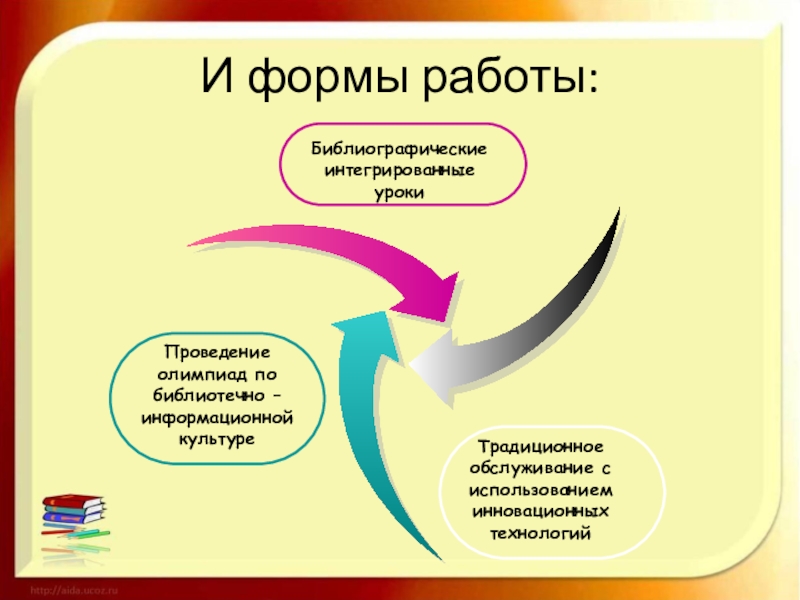 И формы работы:Проведение олимпиад по библиотечно – информационной культуре Традиционное обслуживание с использованием инновационных технологий