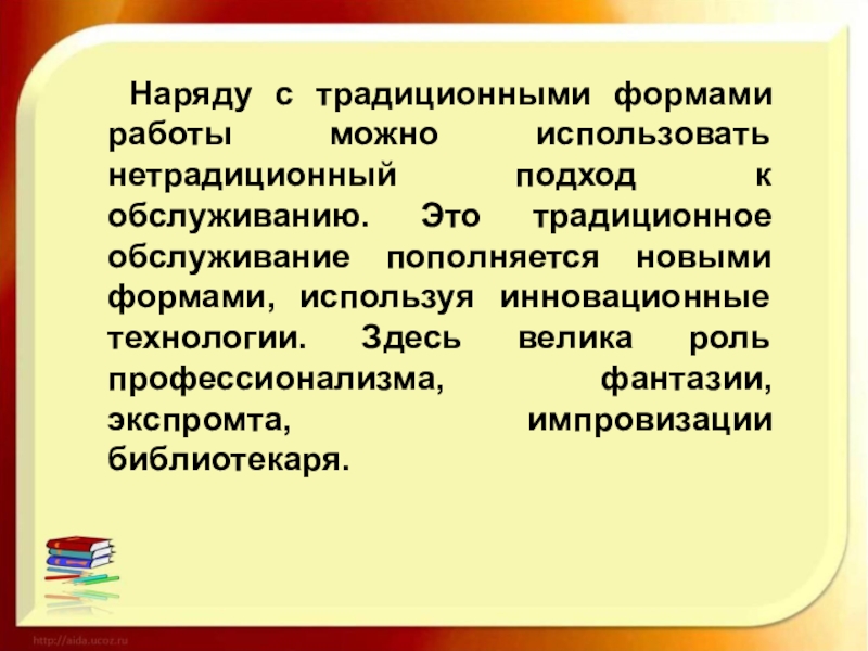 с традиционными формами работы можно использовать нетрадиционный подход к обслуживанию. Это традиционное обслуживание пополняется новыми формами, используя инновационные технологии. Здесь велика роль профессионализма, фантазии, экспромта, импровизации библиотекаря.