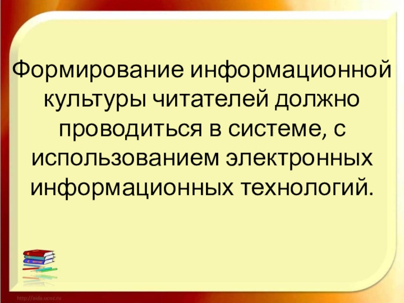 Формирование информационной культуры читателей должно проводиться в системе, с использованием электронных информационных технологий.