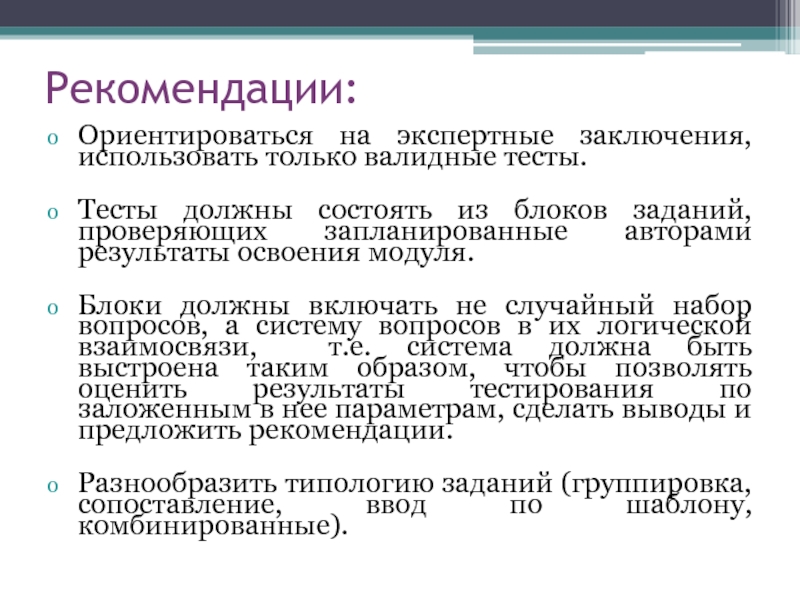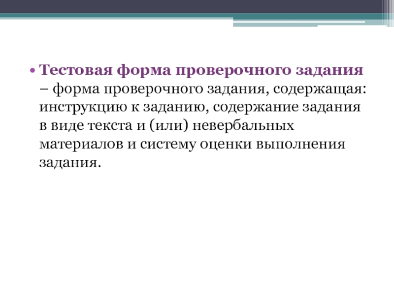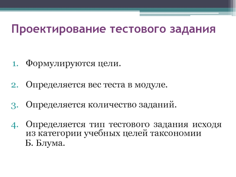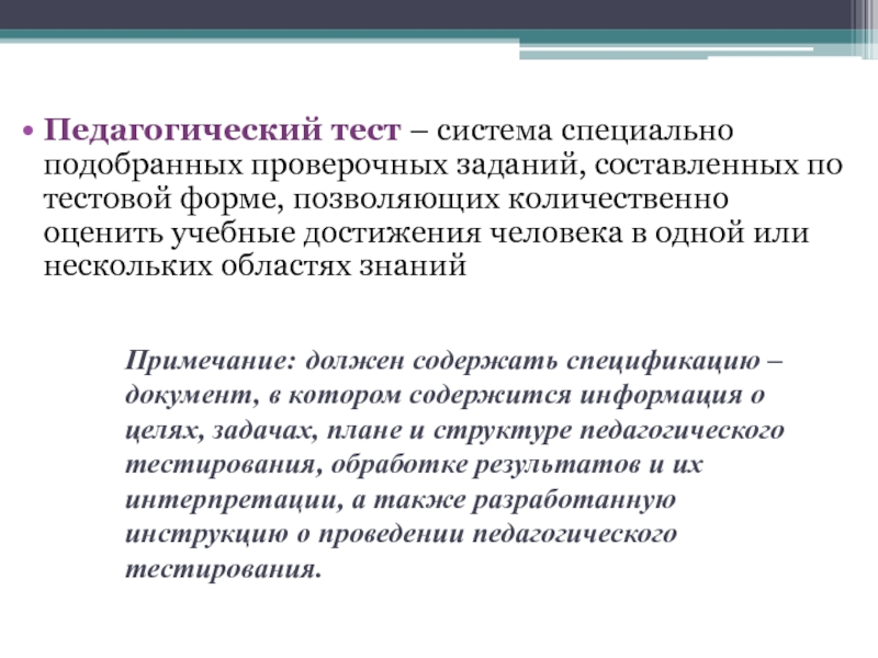 Примечание: должен содержать спецификацию – документ, в котором содержится информация о целях, задачах, плане и структуре педагогического тестирования, обработке результатов и их интерпретации, а также разработанную инструкцию о проведении педагогического тестирования.