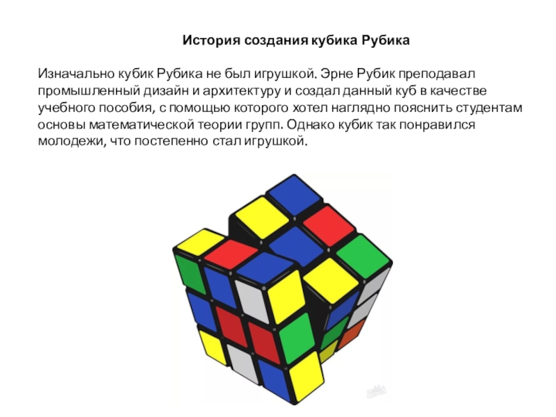 Изначально кубик Рубика не был игрушкой. Эрне Рубик преподавал промышленный дизайн и архитектуру и создал данный куб в качестве учебного пособия, с помощью которого хотел наглядно пояснить студентам основы математической теории групп. Однако кубик так понравился молодежи, что постепенно стал игрушкой.