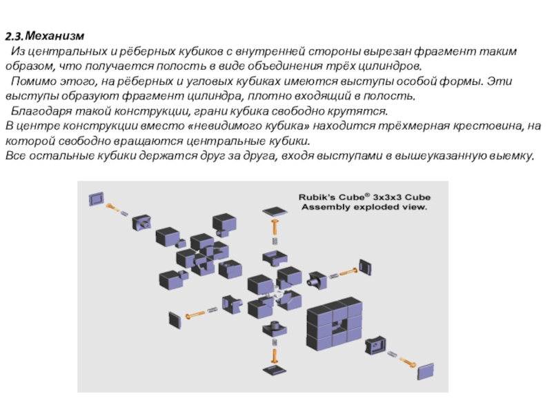 Помимо этого, на рёберных и угловых кубиках имеются выступы особой формы. Эти выступы образуют фрагмент цилиндра, плотно входящий в полость.