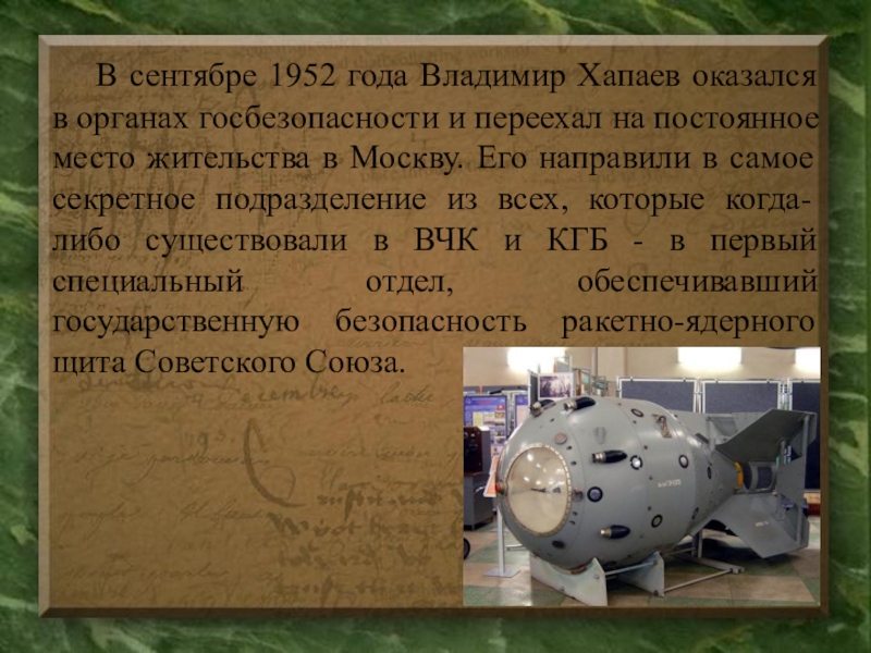Слайд 14 В сентябре 1952 года Владимир Хапаев оказался в органах госбезопасности и