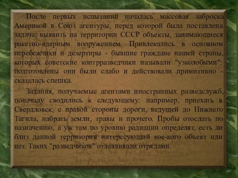 Задания, получаемые агентами иностранных разведслужб, поначалу сводились к следующему: например, приехать в Свердловск, с правой стороны дороги, ведущей до Нижнего Тагила, набрать земли, травы и прочего. Пробы отослать по назначению, а уж там по уровню радиации определят, есть ли близ данной территории интересующий кое-кого объект или нет. Таких "разведчиков" отлавливали отрядами.