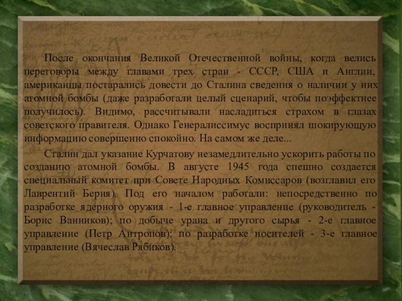 стран - СССР, США и Англии, американцы постарались довести до Сталина сведения о наличии у них атомной бомбы (даже разработали целый сценарий, чтобы поэффектнее получилось). Видимо, рассчитывали насладиться страхом в глазах советского правителя. Однако Генералиссимус воспринял шокирующую информацию совершенно спокойно. На самом же деле...