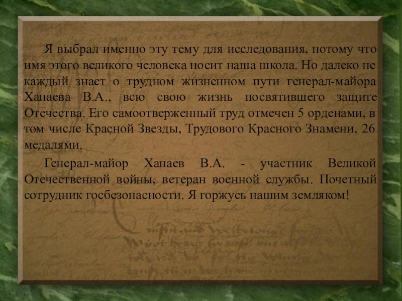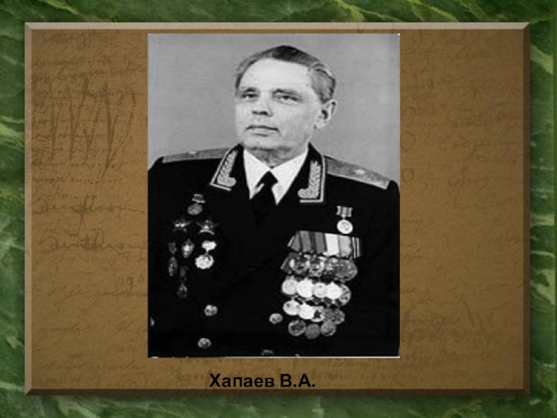 великого человека носит наша школа. Но далеко не каждый знает о трудном жизненном пути генерал-майора Хапаева В.А., всю свою жизнь посвятившего защите Отечества. Его самоотверженный труд отмечен 5 орденами, в том числе Красной Звезды, Трудового Красного Знамени, 26 медалями.