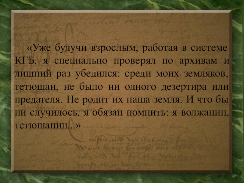 архивам и лишний раз убедился: среди моих земляков, тетюшан, не было ни одного дезертира или предателя. Не родит их наша земля. И что бы ни случилось, я обязан помнить: я волжанин, тетюшанин...»