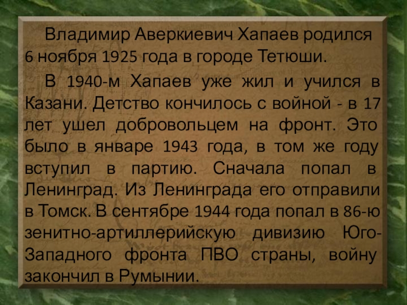 Слайд 11 Владимир Аверкиевич Хапаев родился 6 ноября 1925 года в городе Тетюши.
