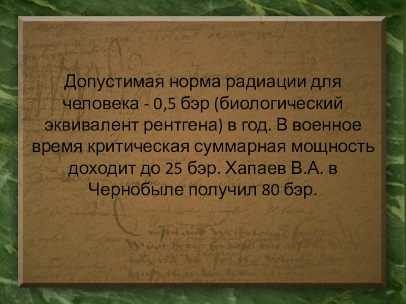 в год. В военное время критическая суммарная мощность доходит до 25 бэр. Хапаев В.А. в Чернобыле получил 80 бэр.