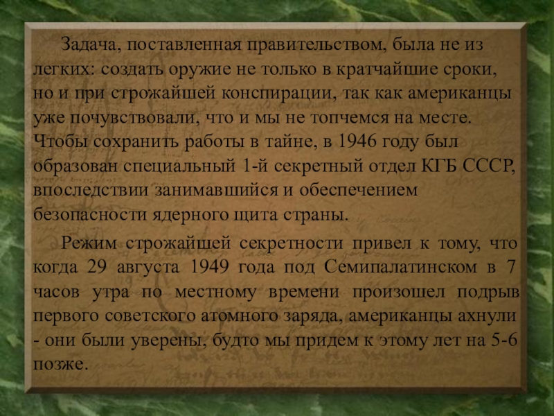 в кратчайшие сроки, но и при строжайшей конспирации, так как американцы уже почувствовали, что и мы не топчемся на месте. Чтобы сохранить работы в тайне, в 1946 году был образован специальный 1-й секретный отдел КГБ СССР, впоследствии занимавшийся и обеспечением безопасности ядерного щита страны.