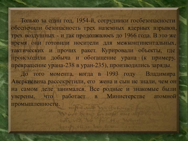 До того момента, когда в 1993 году Владимира Аверкиевича рассекретили, его жена и сын не знали, чем он на самом деле занимался. Все родные и знакомые были уверены, что работает в Министерстве атомной промышленности.