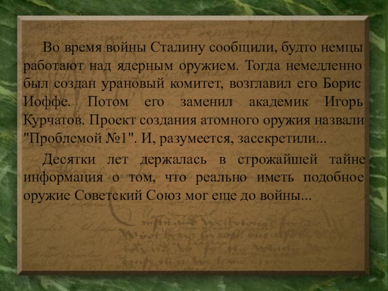 Слайд 17 Во время войны Сталину сообщили, будто немцы работают над ядерным оружием.