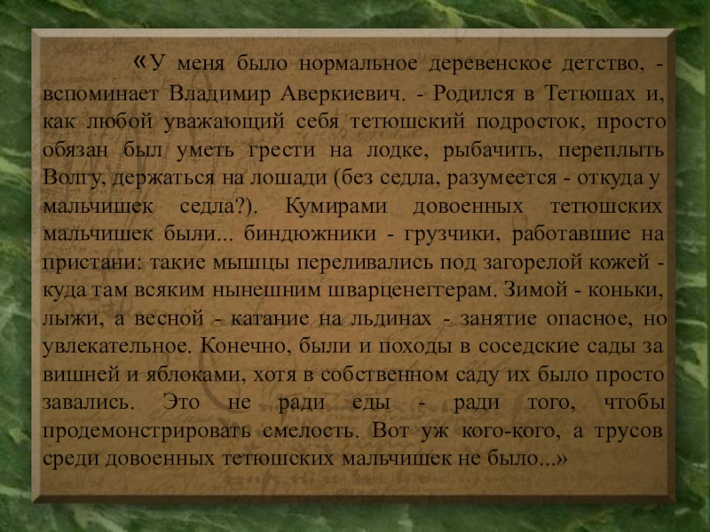 Владимир Аверкиевич. - Родился в Тетюшах и, как любой уважающий себя тетюшский подросток, просто обязан был уметь грести на лодке, рыбачить, переплыть Волгу, держаться на лошади (без седла, разумеется - откуда у мальчишек седла?). Кумирами довоенных тетюшских мальчишек были... биндюжники - грузчики, работавшие на пристани: такие мышцы переливались под загорелой кожей - куда там всяким нынешним шварценеггерам. Зимой - коньки, лыжи, а весной - катание на льдинах - занятие опасное, но увлекательное. Конечно, были и походы в соседские сады за вишней и яблоками, хотя в собственном саду их было просто завались. Это не ради еды - ради того, чтобы продемонстрировать смелость. Вот уж кого-кого, а трусов среди довоенных тетюшских мальчишек не было...»