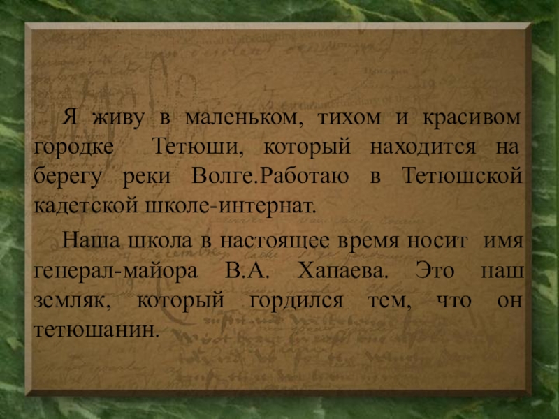 Наша школа в настоящее время носит имя генерал-майора В.А. Хапаева. Это наш земляк, который гордился тем, что он тетюшанин.