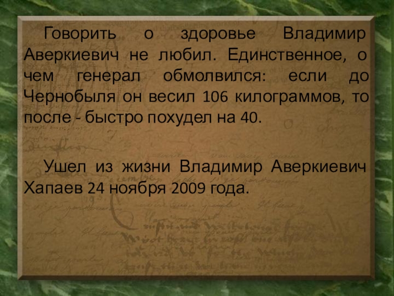 Слайд 38 Говорить о здоровье Владимир Аверкиевич не любил. Единственное, о чем генерал