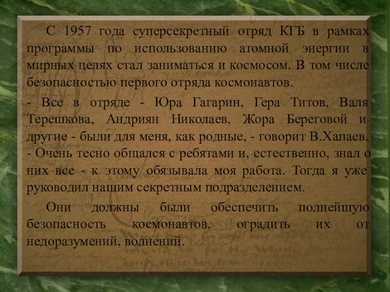 - Все в отряде - Юра Гагарин, Гера Титов, Валя Терешкова, Андриян Николаев, Жора Береговой и другие - были для меня, как родные, - говорит В.Хапаев. - Очень тесно общался с ребятами и, естественно, знал о них все - к этому обязывала моя работа. Тогда я уже руководил нашим секретным подразделением.