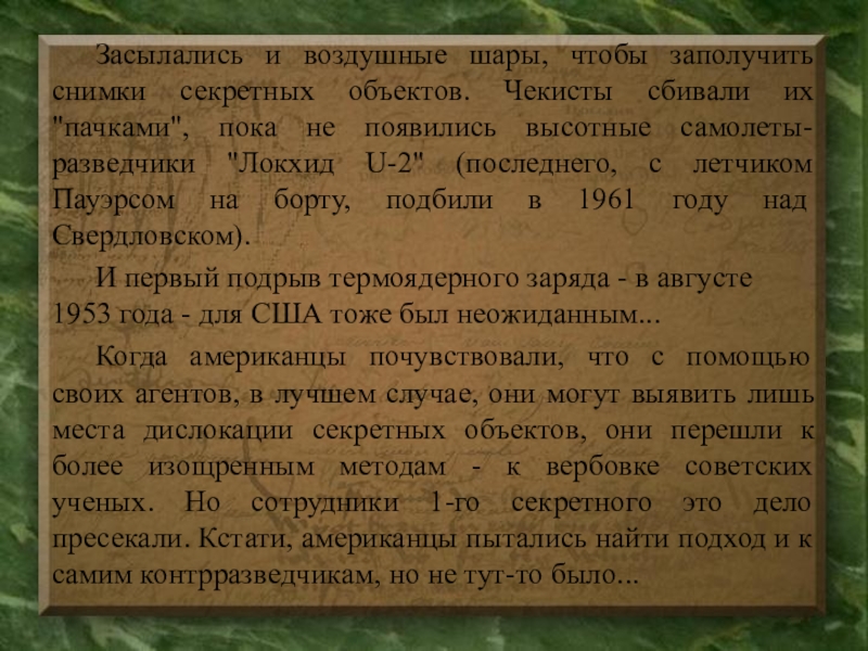 Слайд 24 Засылались и воздушные шары, чтобы заполучить снимки секретных объектов. Чекисты сбивали