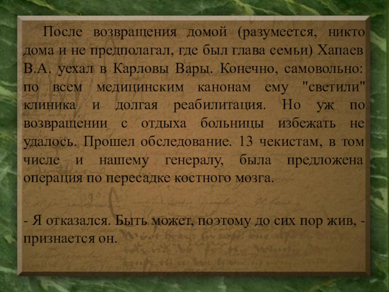 глава семьи) Хапаев В.А. уехал в Карловы Вары. Конечно, самовольно: по всем медицинским канонам ему "светили" клиника и долгая реабилитация. Но уж по возвращении с отдыха больницы избежать не удалось. Прошел обследование. 13 чекистам, в том числе и нашему генералу, была предложена операция по пересадке костного мозга.