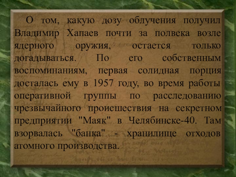 Слайд 30 О том, какую дозу облучения получил Владимир Хапаев почти за полвека
