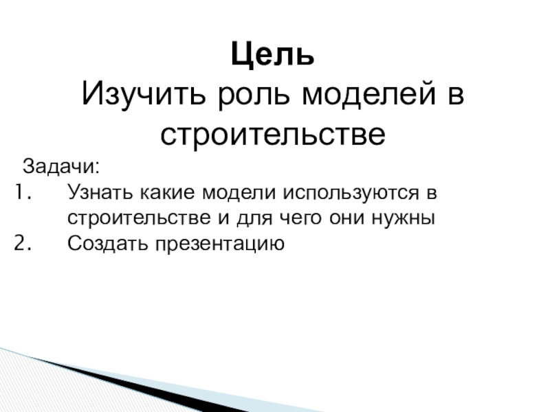 ЦельИзучить роль моделей в строительствеЗадачи:Узнать какие модели используются в строительстве и для чего они нужныСоздать презентацию