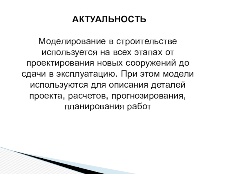 АКТУАЛЬНОСТЬМоделирование в строительстве используется на всех этапах от проектирования новых сооружений до сдачи в эксплуатацию. При