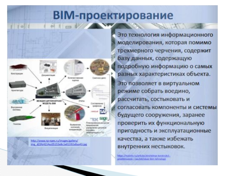 сооружений до сдачи в эксплуатацию. При этом модели используются для описания деталей проекта, расчетов, прогнозирования, планирования работ
