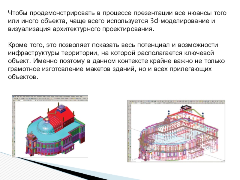 Чтобы продемонстрировать в процессе презентации все нюансы того или иного объекта, чаще всего используется 3d-моделирование и визуализация
