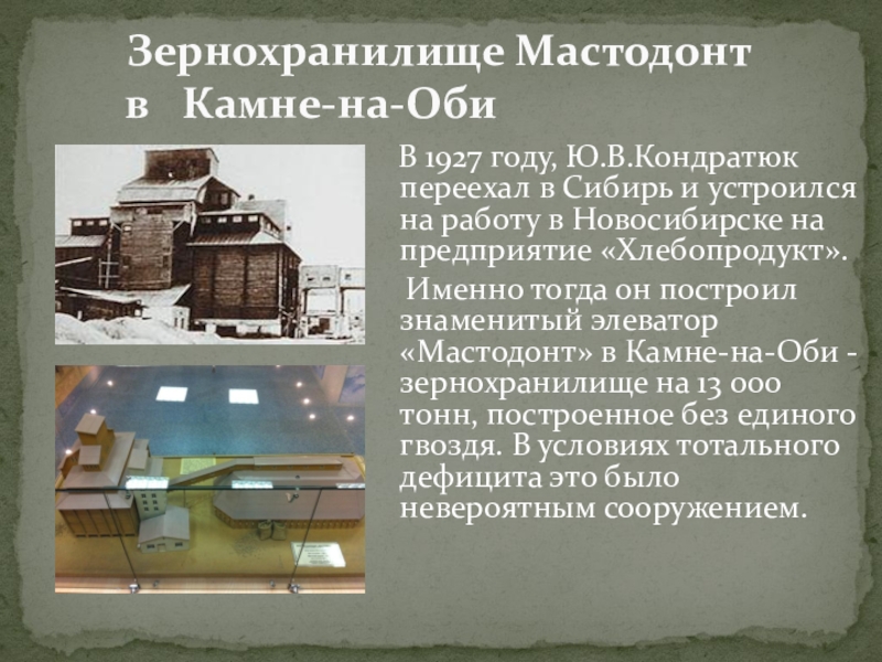 Именно тогда он построил знаменитый элеватор «Мастодонт» в Камне-на-Оби - зернохранилище на 13 000 тонн, построенное без единого гвоздя. В условиях тотального дефицита это было невероятным сооружением.