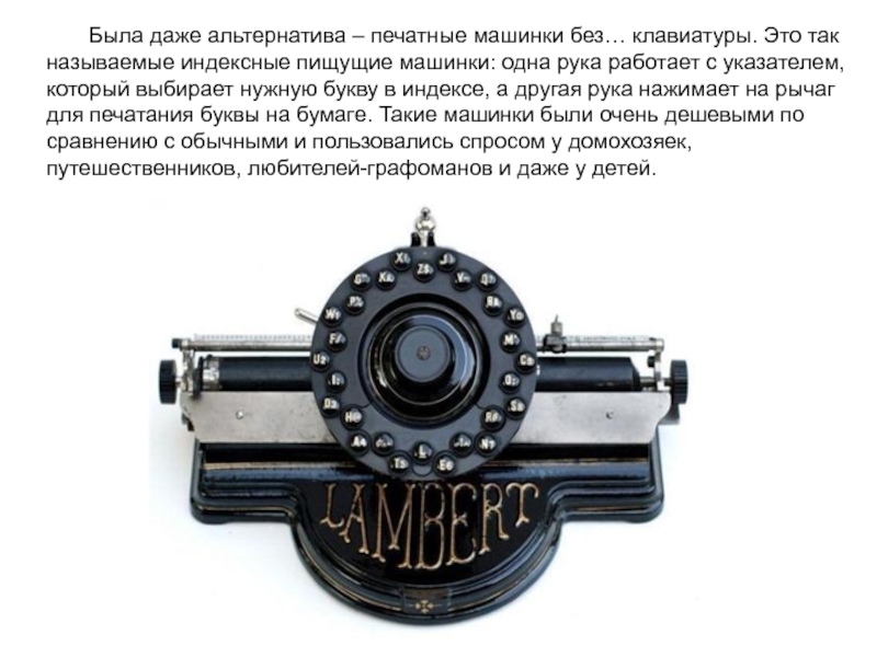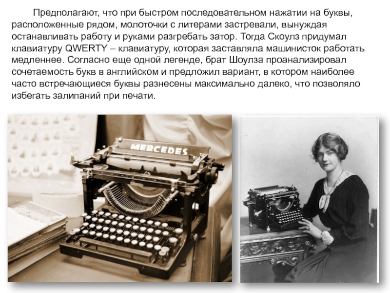Первый вариант их машинки имел два ряда клавиш с цифрами и алфавитным расположением букв от A до Z (строчных букв не было, только заглавные; так же не было цифр 1 и 0 – вместо них использовались буквы I и O), однако такой вариант оказался неудобным. Почему?