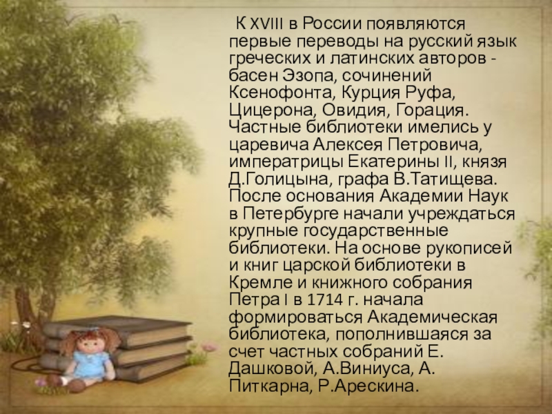 и латинских авторов - басен Эзопа, сочинений Ксенофонта, Курция Руфа, Цицерона, Овидия, Горация. Частные библиотеки имелись у царевича Алексея Петровича, императрицы Екатерины II, князя Д.Голицына, графа В.Татищева. После основания Академии Наук в Петербурге начали учреждаться крупные государственные библиотеки. На основе рукописей и книг царской библиотеки в Кремле и книжного собрания Петра I в 1714 г. начала формироваться Академическая библиотека, пополнившаяся за счет частных собраний Е.Дашковой, А.Виниуса, А.Питкарна, Р.Арескина.