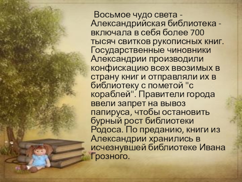 Слайд 10 Восьмое чудо света - Александрийская библиотека - включала в себя более