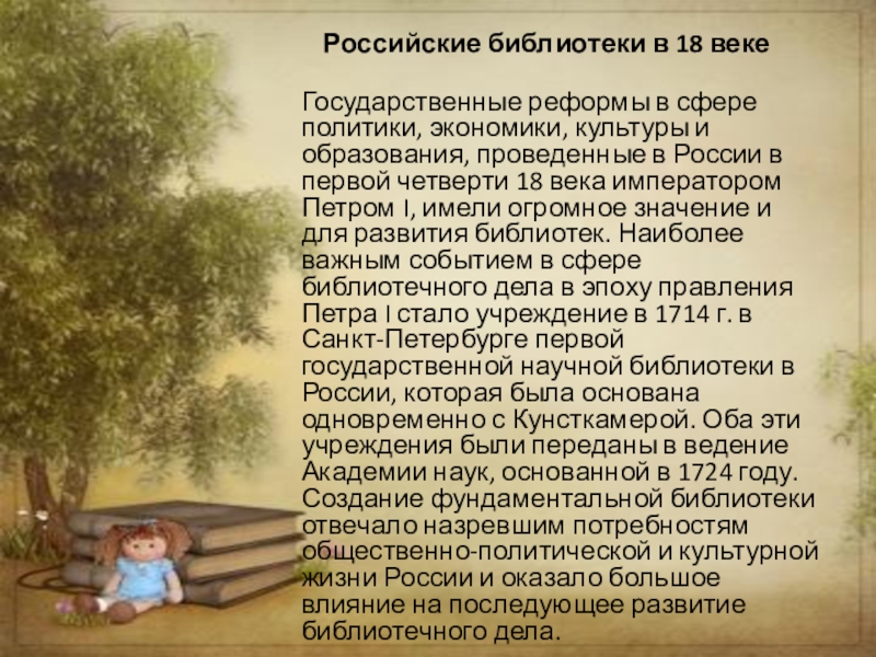 и образования, проведенные в России в первой четверти 18 века императором Петром I, имели огромное значение и для развития библиотек. Наиболее важным событием в сфере библиотечного дела в эпоху правления Петра I стало учреждение в 1714 г. в Санкт-Петербурге первой государственной научной библиотеки в России, которая была основана одновременно с Кунсткамерой. Оба эти учреждения были переданы в ведение Академии наук, основанной в 1724 году. Создание фундаментальной библиотеки отвечало назревшим потребностям общественно-политической и культурной жизни России и оказало большое влияние на последующее развитие библиотечного дела.