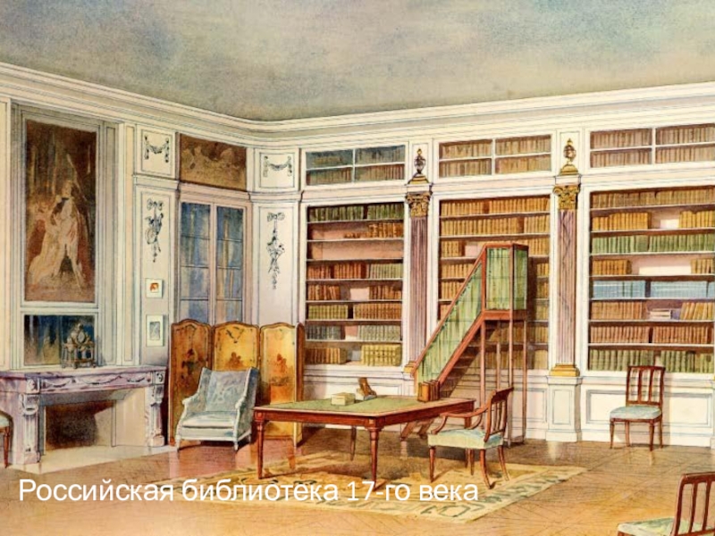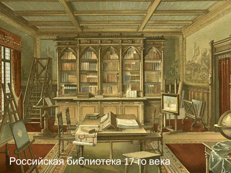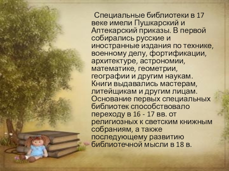 Слайд 22 Специальные библиотеки в 17 веке имели Пушкарский и Аптекарский приказы. В
