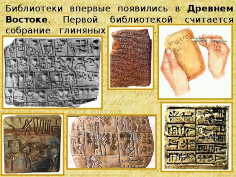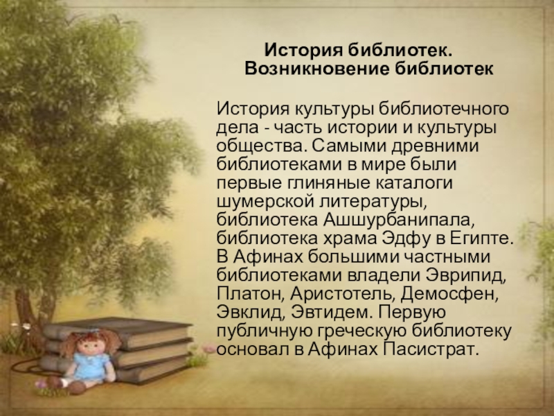 культуры общества. Самыми древними библиотеками в мире были первые глиняные каталоги шумерской литературы, библиотека Ашшурбанипала, библиотека храма Эдфу в Египте. В Афинах большими частными библиотеками владели Эврипид, Платон, Аристотель, Демосфен, Эвклид, Эвтидем. Первую публичную греческую библиотеку основал в Афинах Пасистрат.