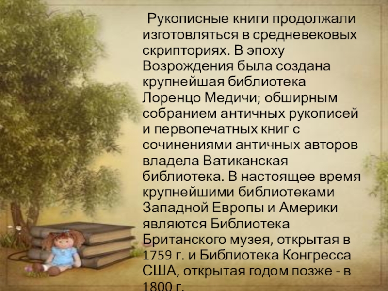 создана крупнейшая библиотека Лоренцо Медичи; обширным собранием античных рукописей и первопечатных книг с сочинениями античных авторов владела Ватиканская библиотека. В настоящее время крупнейшими библиотеками Западной Европы и Америки являются Библиотека Британского музея, открытая в 1759 г. и Библиотека Конгресса США, открытая годом позже - в 1800 г.