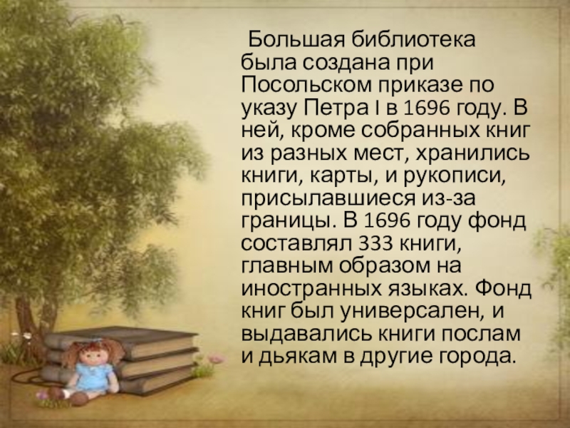 Слайд 21 Большая библиотека была создана при Посольском приказе по указу Петра I