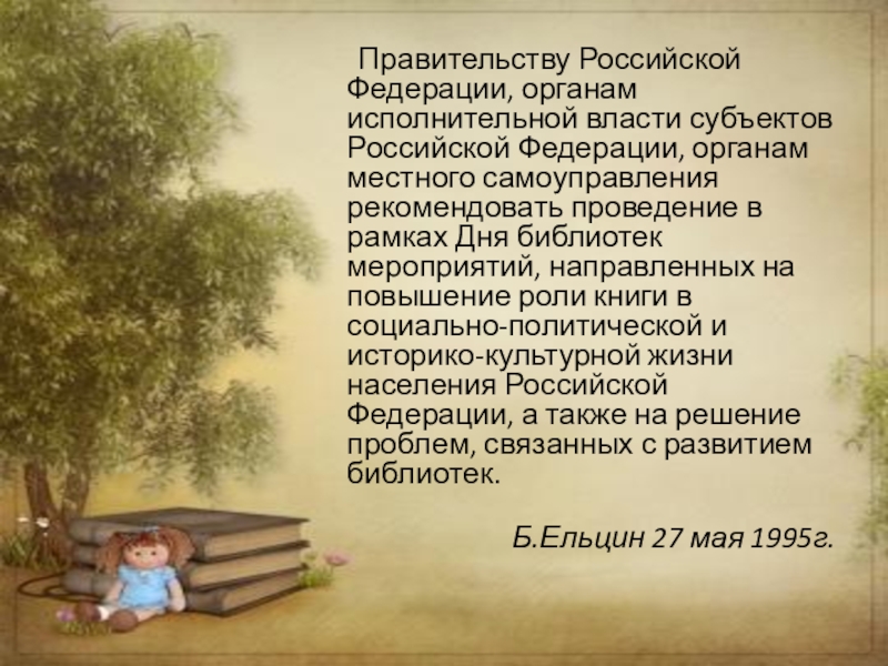 самоуправления рекомендовать проведение в рамках Дня библиотек мероприятий, направленных на повышение роли книги в социально-политической и историко-культурной жизни населения Российской Федерации, а также на решение проблем, связанных с развитием библиотек.