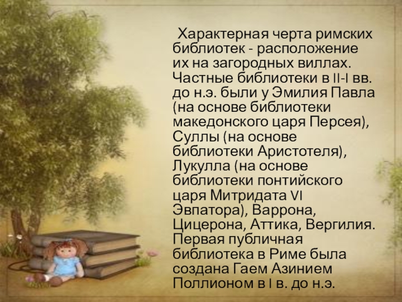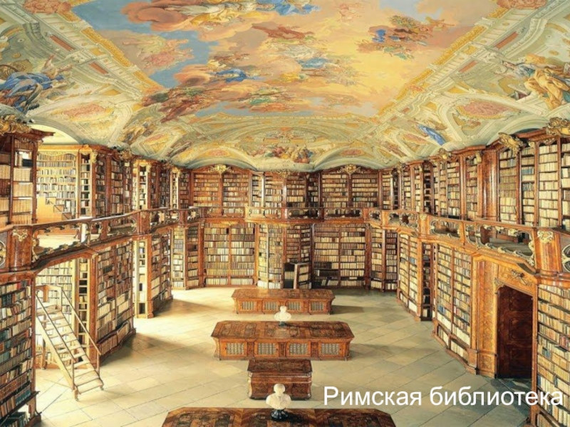 Слайд 13 Характерная черта римских библиотек - расположение их на загородных виллах. Частные