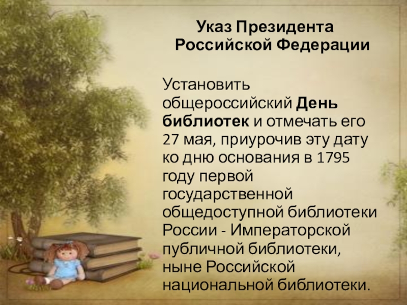 мая, приурочив эту дату ко дню основания в 1795 году первой государственной общедоступной библиотеки России - Императорской публичной библиотеки, ныне Российской национальной библиотеки.
