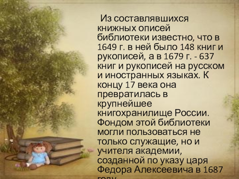 ней было 148 книг и рукописей, а в 1679 г. - 637 книг и рукописей на русском и иностранных языках. К концу 17 века она превратилась в крупнейшее книгохранилище России. Фондом этой библиотеки могли пользоваться не только служащие, но и учителя академии, созданной по указу царя Федора Алексеевича в 1687 году.