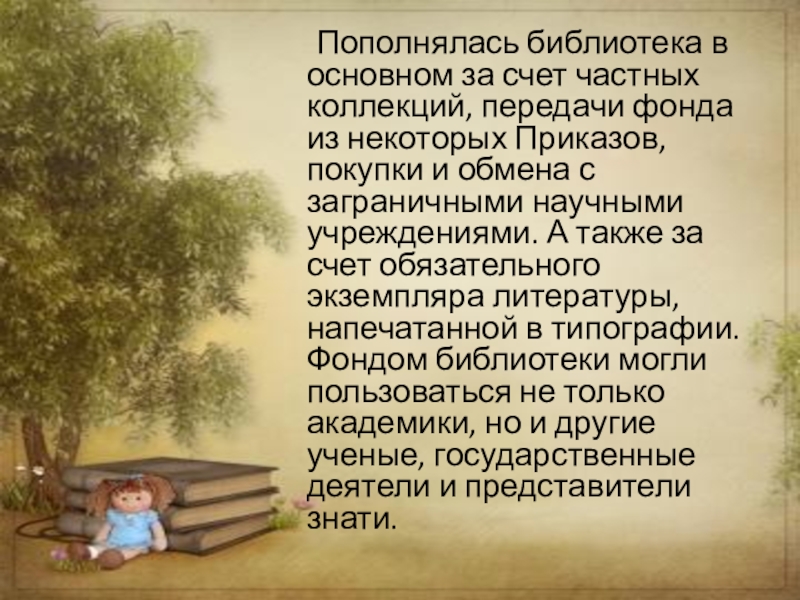 Слайд 26 Пополнялась библиотека в основном за счет частных коллекций, передачи фонда из