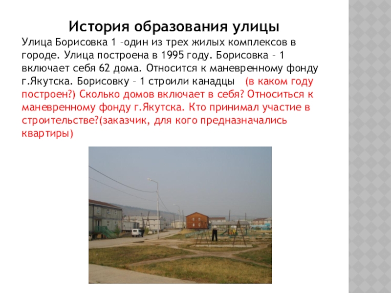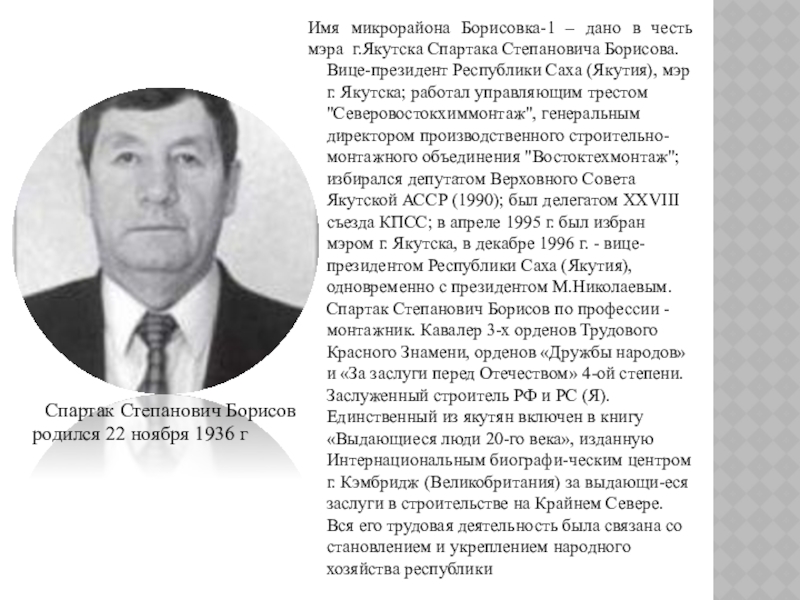 Имя микрорайона Борисовка-1 – дано в честь мэра г.Якутска Спартака Степановича Борисова.