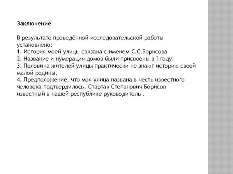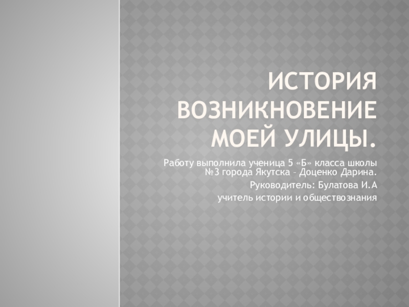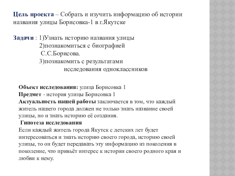 Если каждый житель города Якутск с детских лет будет интересоваться и знать историю своего города, историю своей улицы, то он будет передавать эту информацию из поколения в поколение, что привьёт интерес к истории своего родного края и любви к нему.