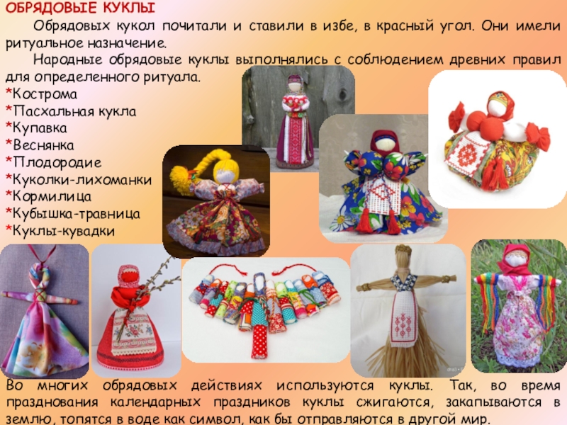 Во многих обрядовых действиях используются куклы. Так, во время празднования календарных праздников куклы сжигаются, закапываются в землю, топятся в воде как символ, как бы отправляются в другой мир.