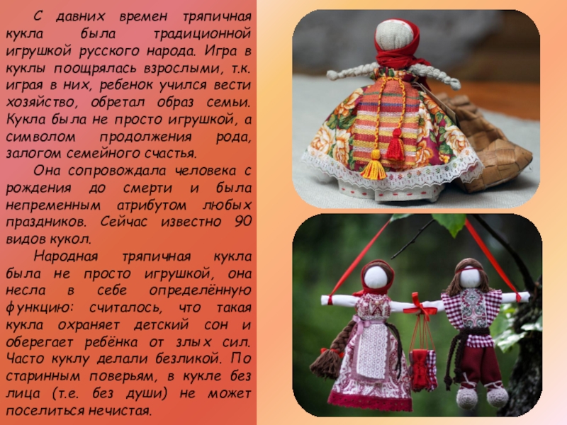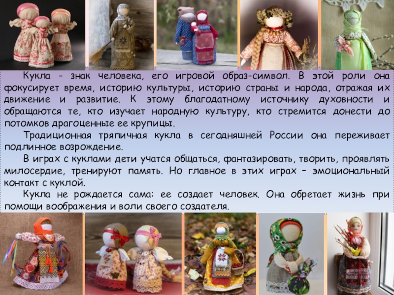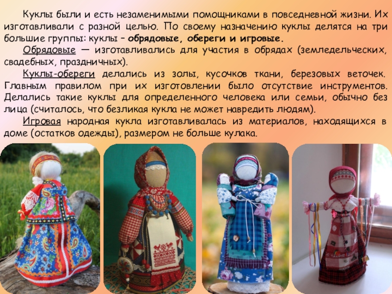 Слайд 3Куклы были и есть незаменимыми помощниками в повседневной жизни. Их изготавливали